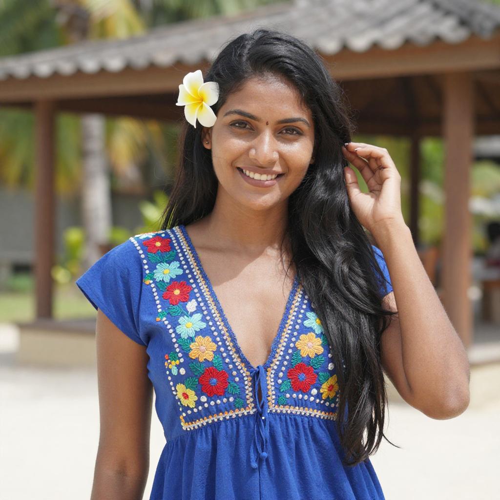 Photograph of a smiling woman with long black hair, wearing a blue, low-cut, embroidered dress with colorful patterns, and a yellow flower in her hair. She stands outdoors, touching her hair with one hand, in a sunny, tropical setting with wooden structures and greenery in the background.