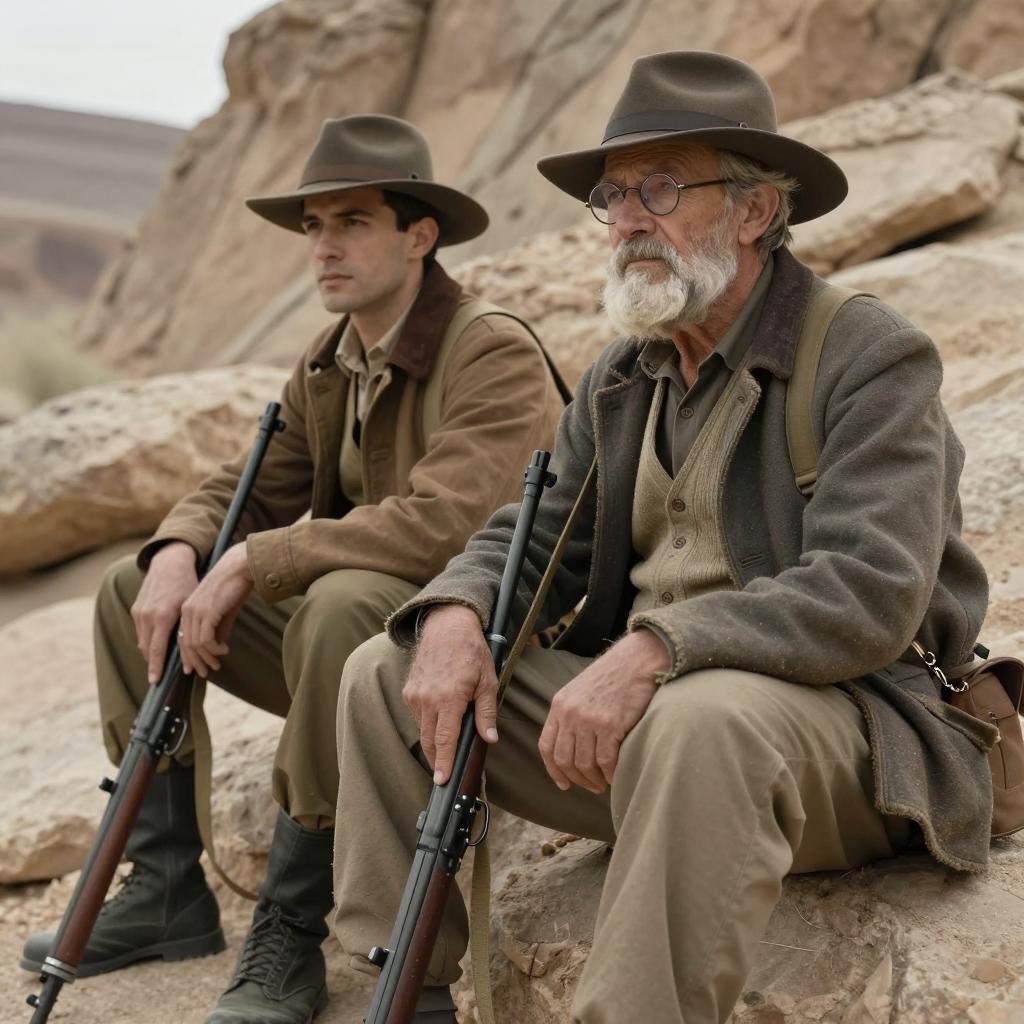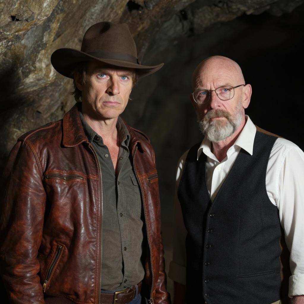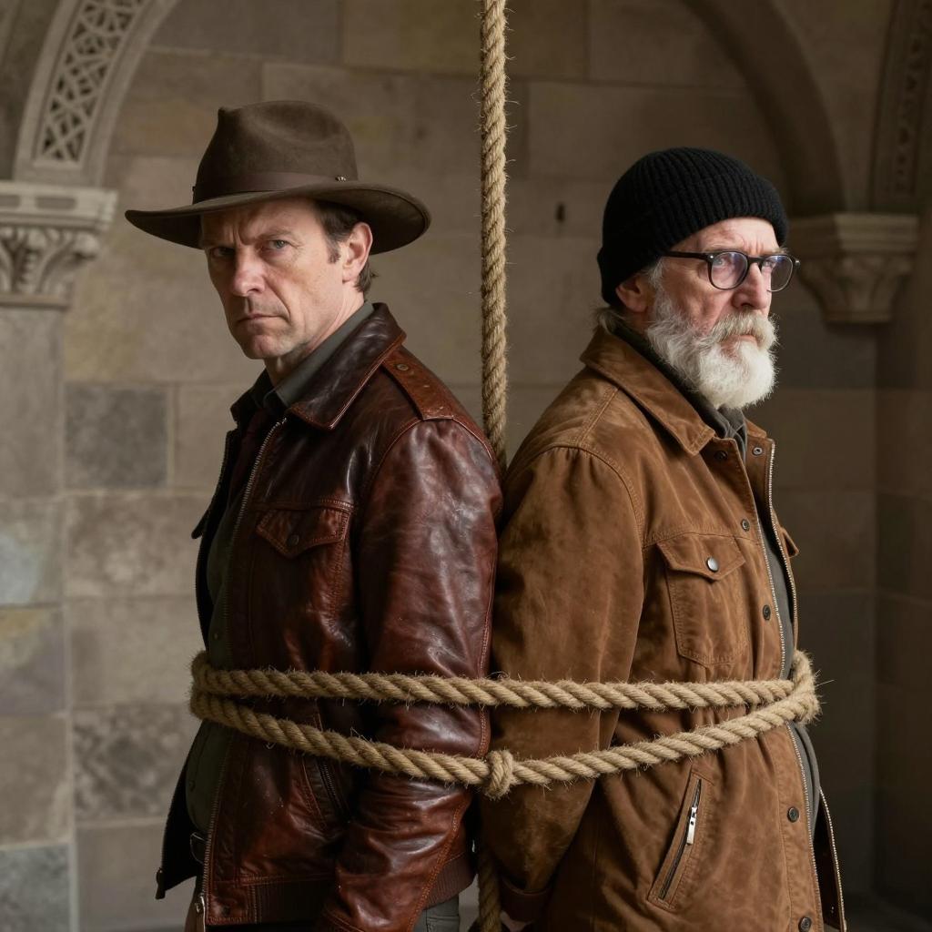 Two men bound with thick rope in a dimly lit stone room. The man on the left, with a stern expression, wears a brown hat and leather jacket. The man on the right, with a white beard and glasses, wears a black knit cap and brown jacket. Both stand back-to-back. Background features carved stone decorations.