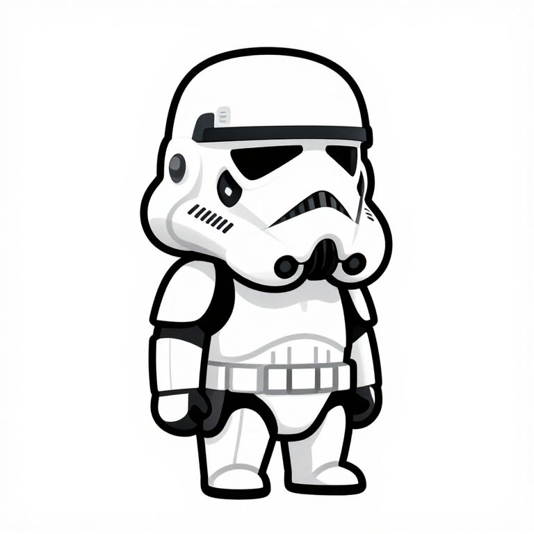 The image features a cute, stylized illustration of a Star Wars stormtrooper, rendered in a cartoonish, simplified form. The stormtrooper is depicted from the side, wearing the iconic white armor with black accents. The helmet is detailed with a visor, vents, and a communication device. The stormtrooper's body is also white, with black gloves and a black belt. The background is plain white, and the image is framed with a white border, giving it a clean, polished look. The overall composition is simple yet effective, capturing the essence of the stormtrooper character in a whimsical and approachable manner.