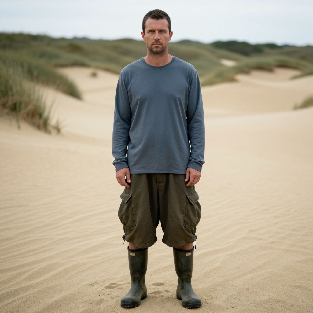 Photograph of a muscular, Caucasian man with short dark hair and a trimmed beard, standing in a sandy dune landscape. He wears a long-sleeved, loose-fitting blue shirt, olive green cargo pants, and black rubber boots. The background features rolling sand dunes with sparse green vegetation. The sky is overcast, casting a soft, diffused light over the scene. The man stands with a neutral expression, hands by his sides, in the center of the image. The sand has visible ripples, indicating a gentle breeze.