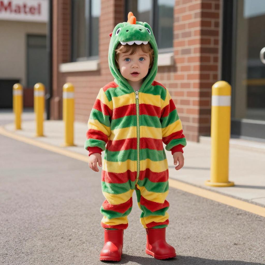 Photograph of a curious toddler with blue eyes, wearing a colorful striped dinosaur onesie, red boots, standing on a sunny street, with yellow b