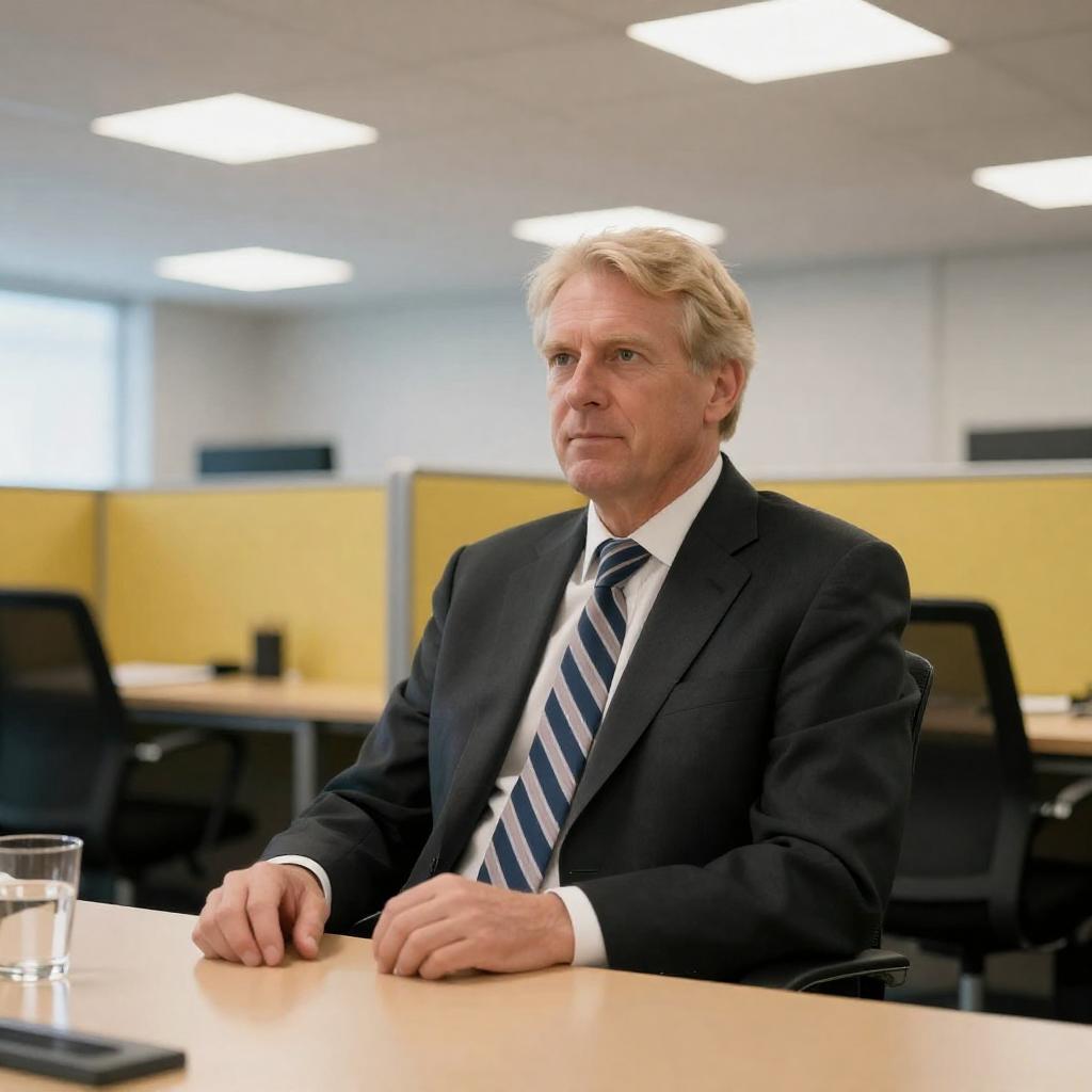 Middle-aged man with blond hair, wearing a dark suit and striped tie, sitting at a conference table, looking slightly to the side. Brightly lit office with a grid-patterned ceiling, yellow partitions, and glass cups on the table. One hand on the table, other out of frame. Background shows office cubicles.