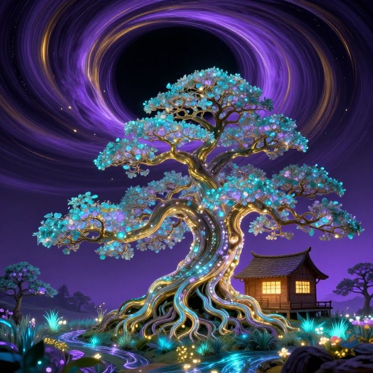 A Giant Tree Harboring an Entire Civilisation, A fantastical depiction of a colossal tree whose sprawling canopy houses an intricate city glowing with bioluminescent lights, The trunk is carved with spiraling pathways leading to hidden markets and lush gardens, Floating lanterns drift gently upward, their golden glow illuminating the ethereal blue mist surrounding the roots, The sky above is painted with an eternal twilight, dotted with luminous creatures that flit among the leaves, Themes of coexistence, nature’s grandeur, and magical ingenuity are explored
