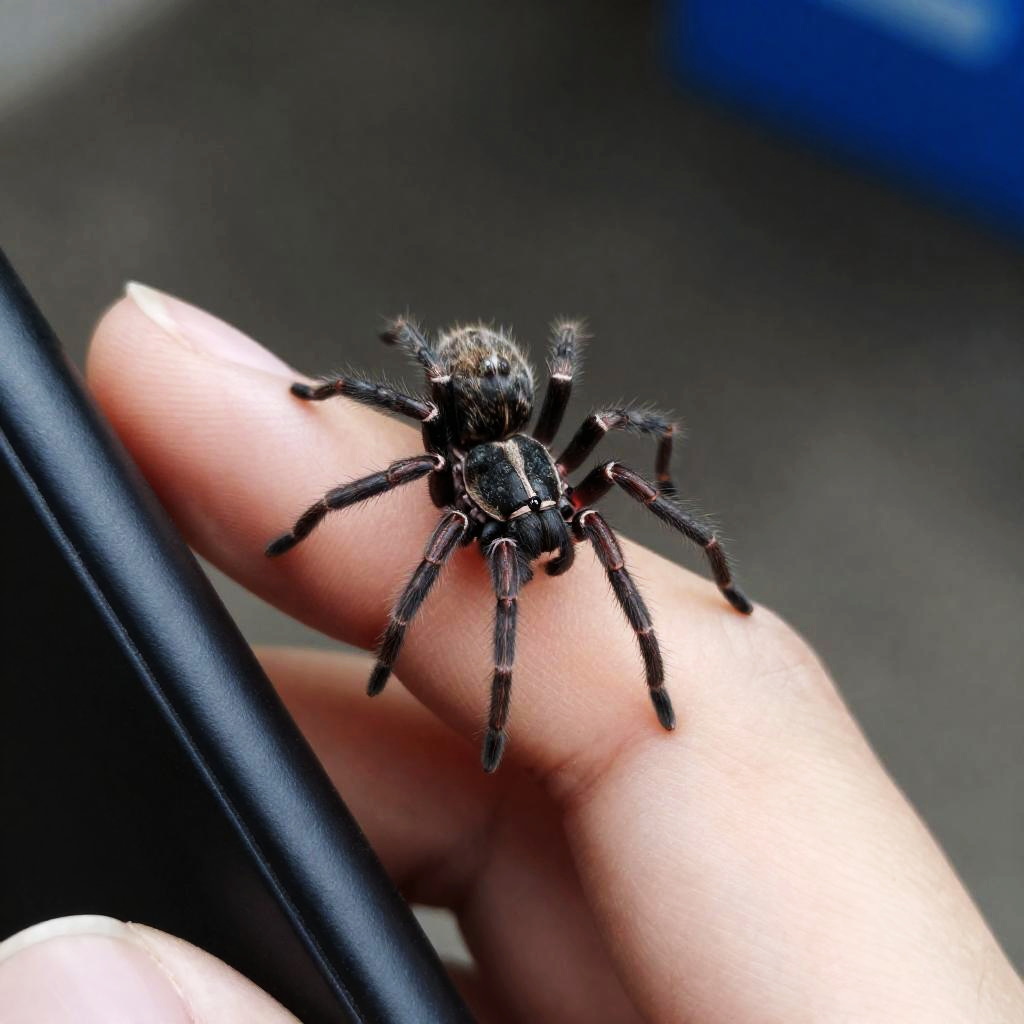 Close-up of a hand with a small, dark-colored spider on the index finger. The hand is holding a black object with a metallic edge. The background is blurred, with dark and blue tones. The spider's legs are visible.