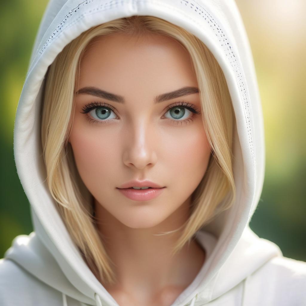 A close-up portrait of a young woman with blonde hair wearing a white hooded garment, expressive green eyes, soft natural lighting highlighting smooth skin and delicate facial features, background softly blurred with cool and warm tones