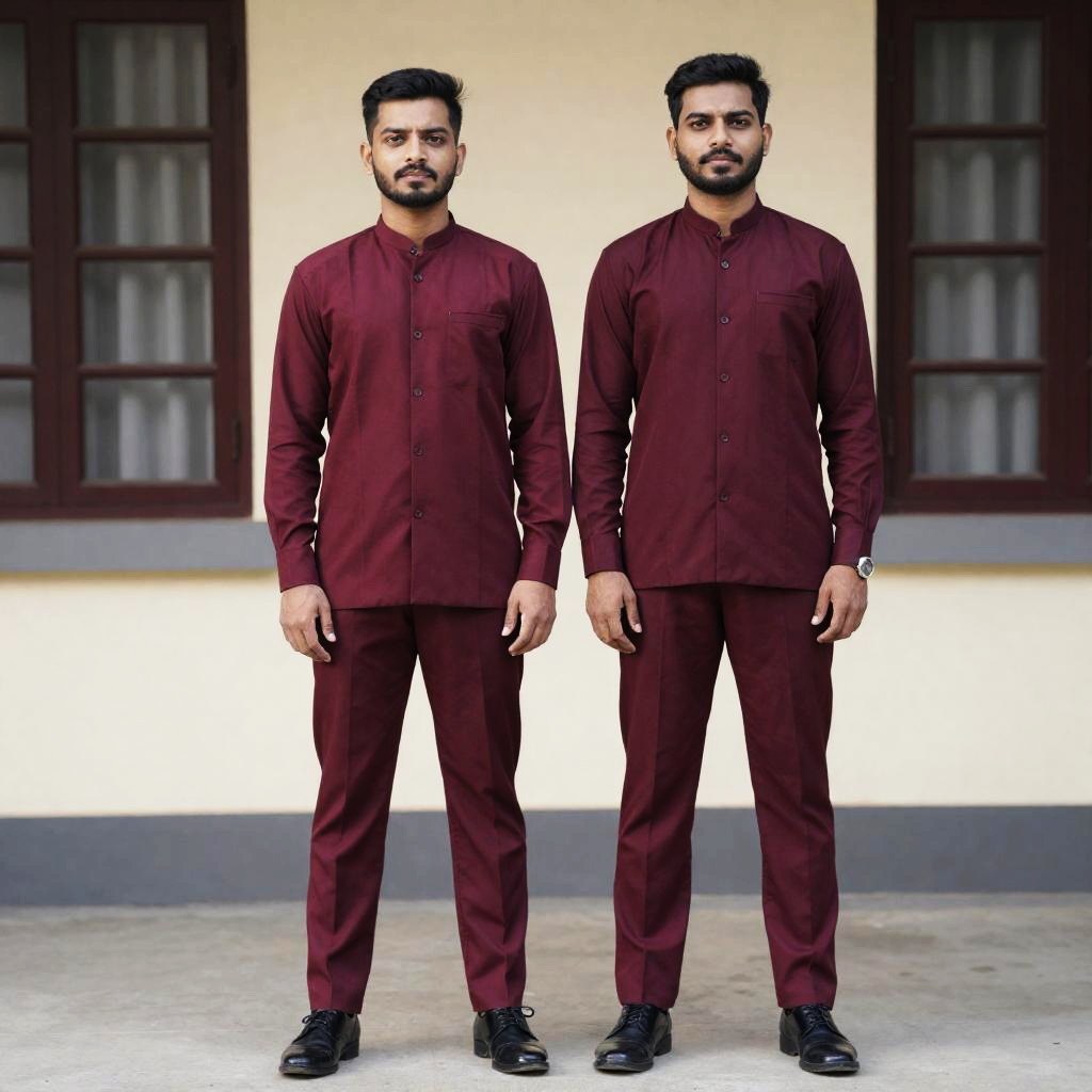 Two Piece Costume, man in a maroon shirt and pants standing in front of a building