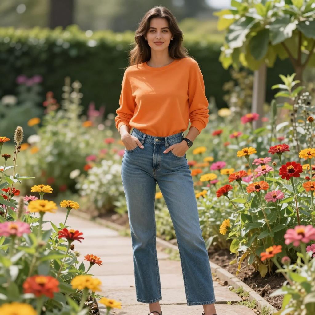 Winter birthday party outfit, photorealistic, portrait of a beautiful young woman, long brown hair, light skin, standing in a colorful garden, wearing a cream turtleneck sweater and beige skirt with brown belt, hands in pockets, soft sunlight, blooming pink and yellow roses in background, blurred greenery, realistic ures, warm color palette, confident expression, slight smile, casual yet elegant outfit, relaxed pose, natural light, outdoor setting, detailed clothing, serene atmosphere