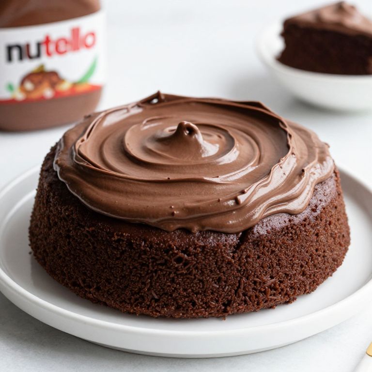 Photograph of a rich, dark chocolate cake on a white plate. The cake has a moist, dense texture with a smooth, glossy layer of chocolate Nutella frosting on top, swirled in a circular pattern. In the blurred background, there's a jar of Nutella with a red and black label, and another cake with similar frosting. The overall color palette includes dark browns from the cake and frosting, contrasting with the white plate and background. The lighting highlights the cake's texture and frosting's sheen.