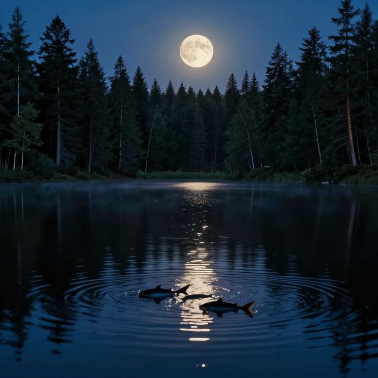 Moonlit lake shimmers beneath a radiant full moon, surrounded by dense evergreen forests, as silhouetted fish swim gracefully, creating ripples that reflect the serene nocturnal landscape.