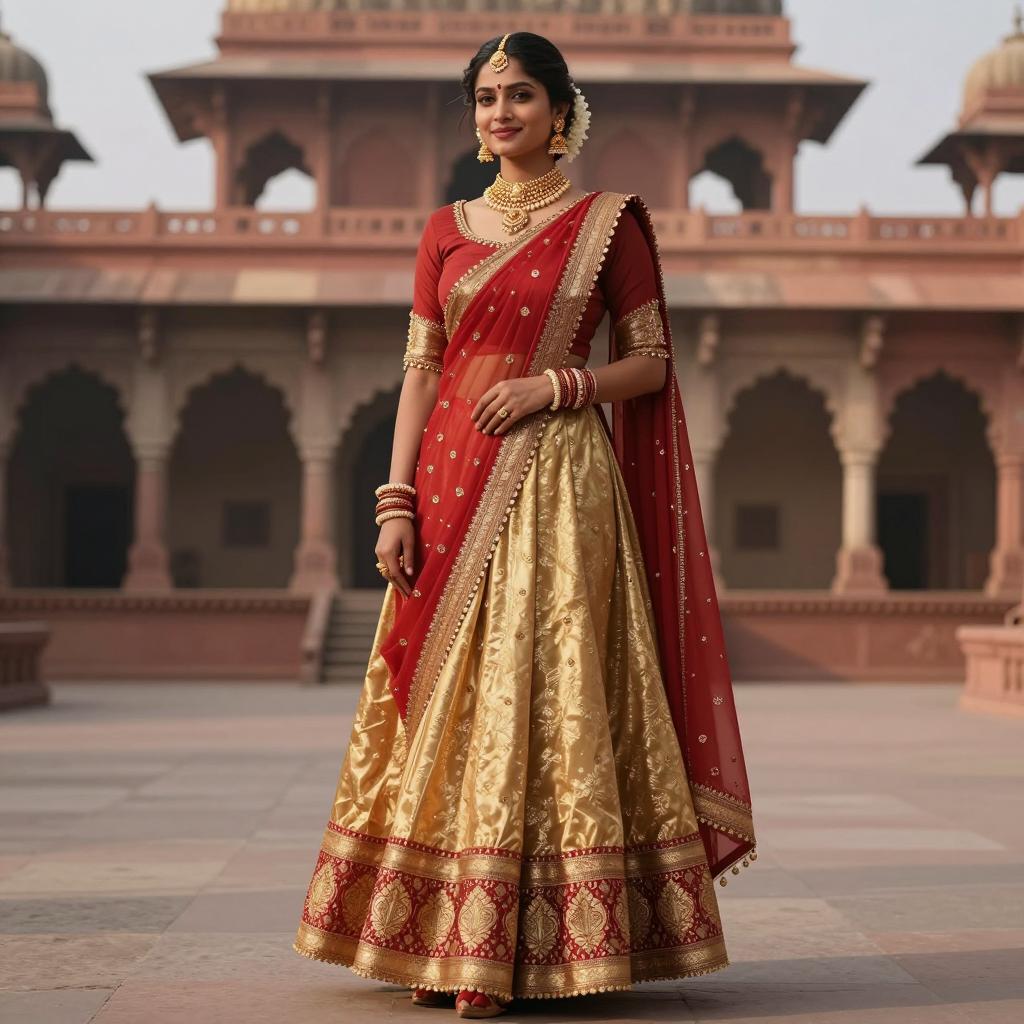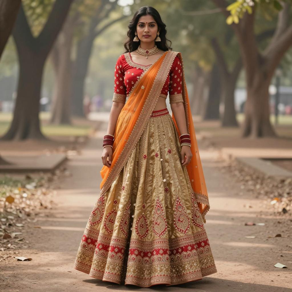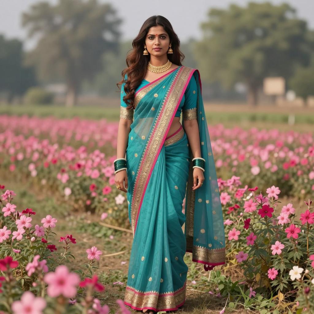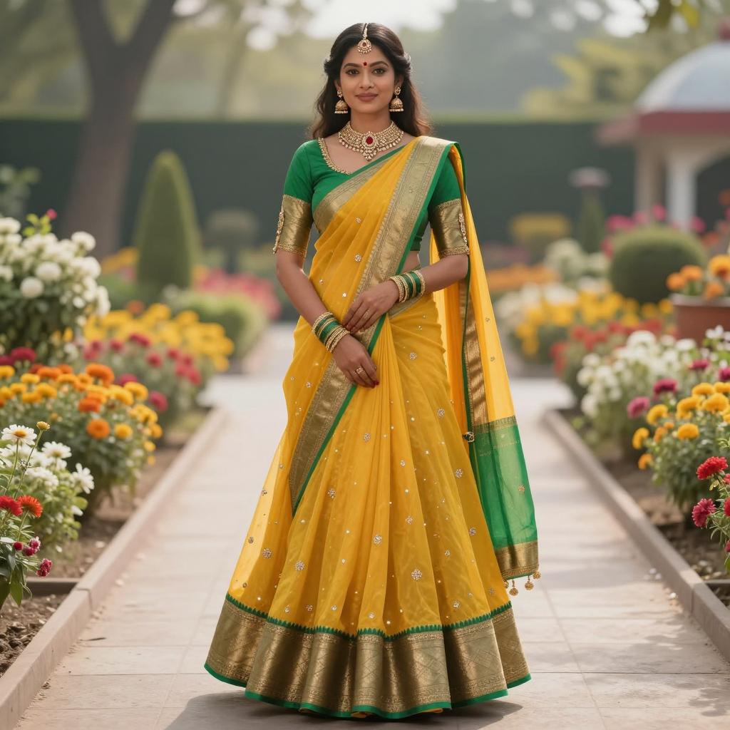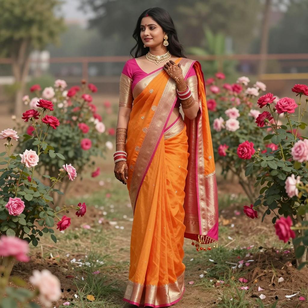 Mehandi colour lehenga, photograph of a beautiful Indian woman, long black hair, wearing an orange saree with pink borders, traditional jewelry including necklace, earrings, and bracelets, standing in a garden with blooming roses, daytime, natural light, sunlight, bright colors, traditional Indian attire, elegant, confident, standing slightly to the right, hand raised to chest, floral background, vibrant, detailed, realistic, portrait, full body shot