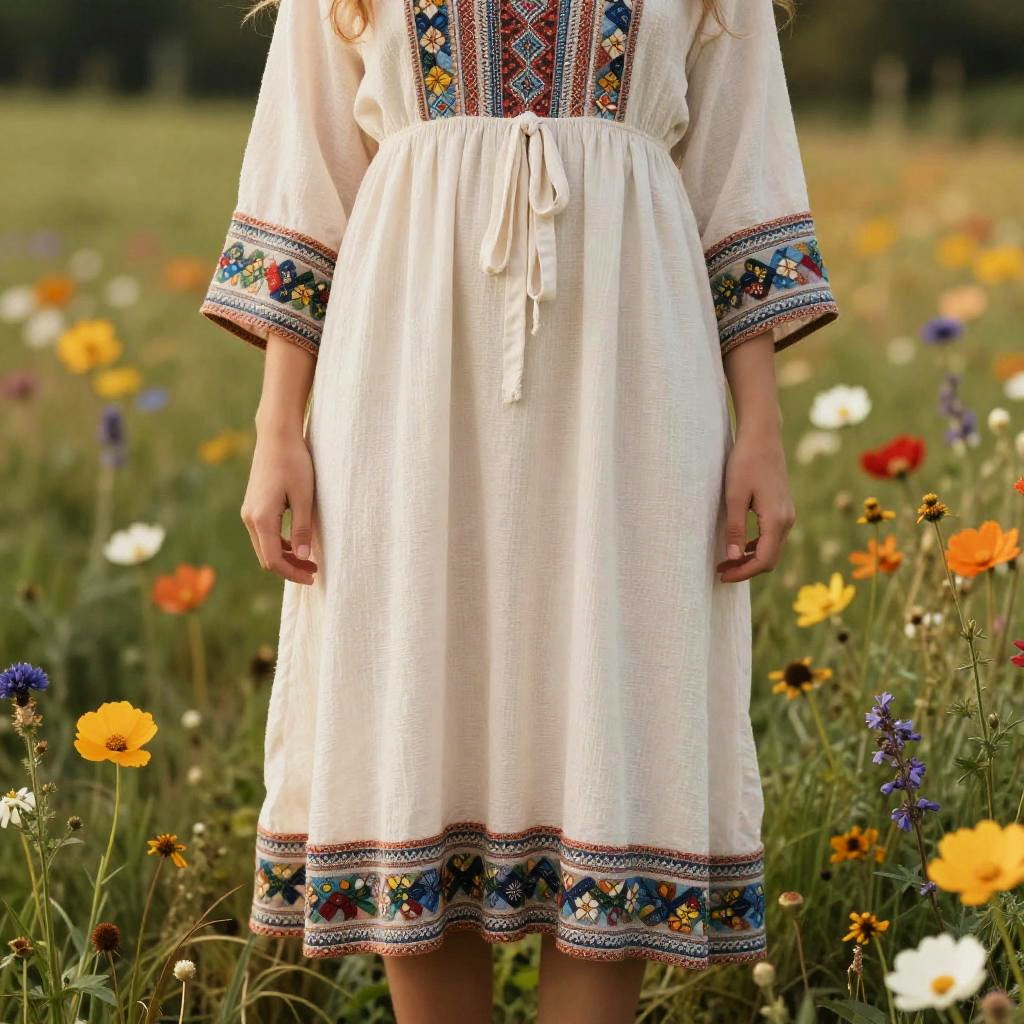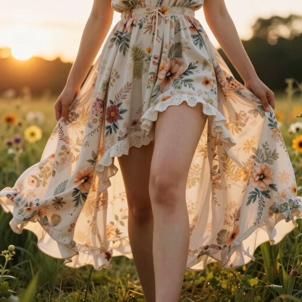 Thick thighs dress flowing elegantly in a vibrant garden at sunset, soft fabric clinging gently, intricate floral patterns, warm golden light, serene atmosphere.