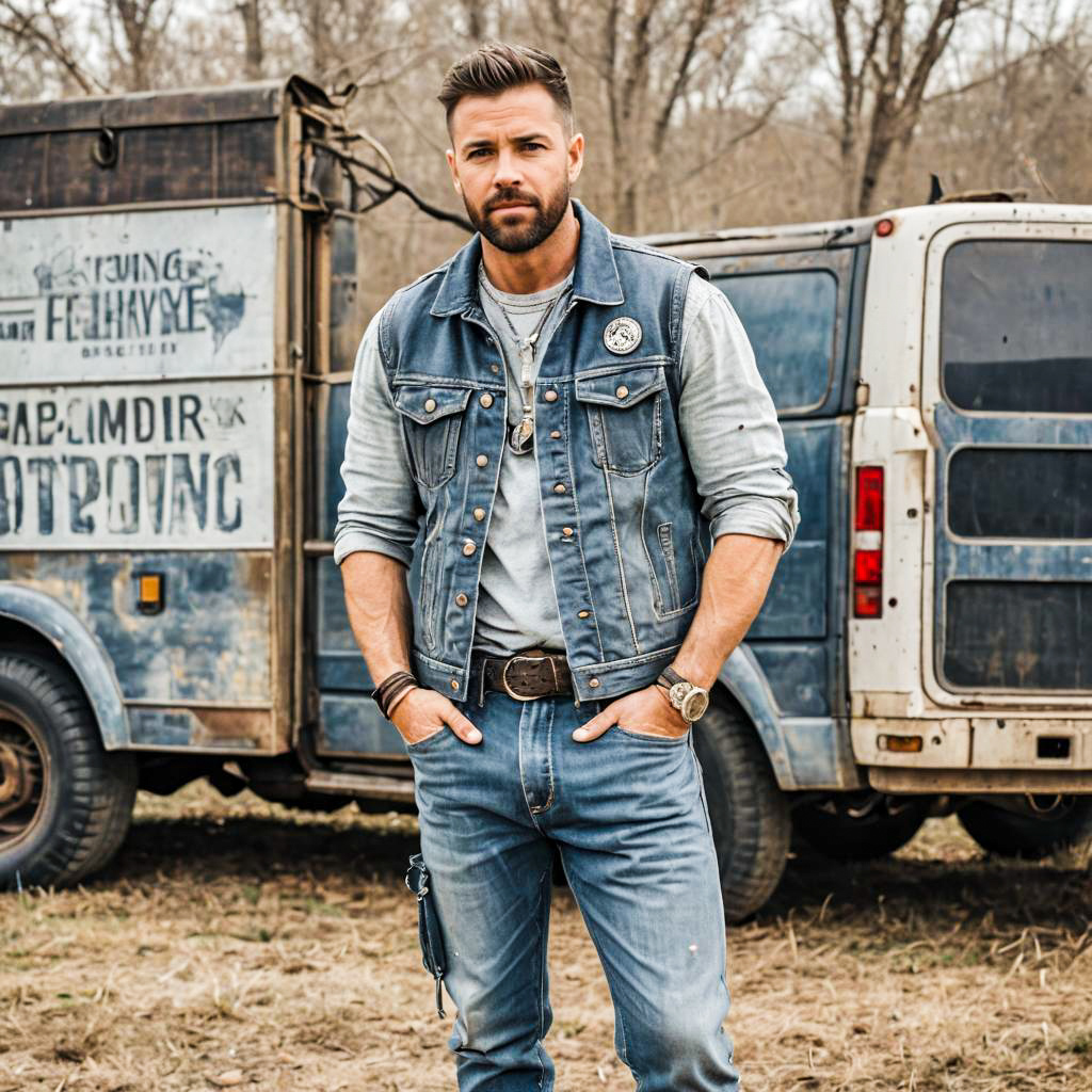 Photo of a Rugged Build man, Short Textured, country outfit, denim vest with a graphic tee and combat boots, grey and white mottled fabric, subdued pastel hues