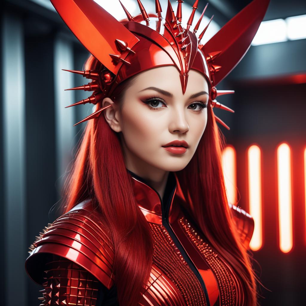 Portrait of a regal woman with long straight red hair wearing an avant-garde headdress featuring sharp spikes. She is dressed in a bold, shiny red outfit with textured, studded sleeves. Her intense makeup includes red lipstick, set against a dramatic modern futuristic indoor background with red and orange lighting.