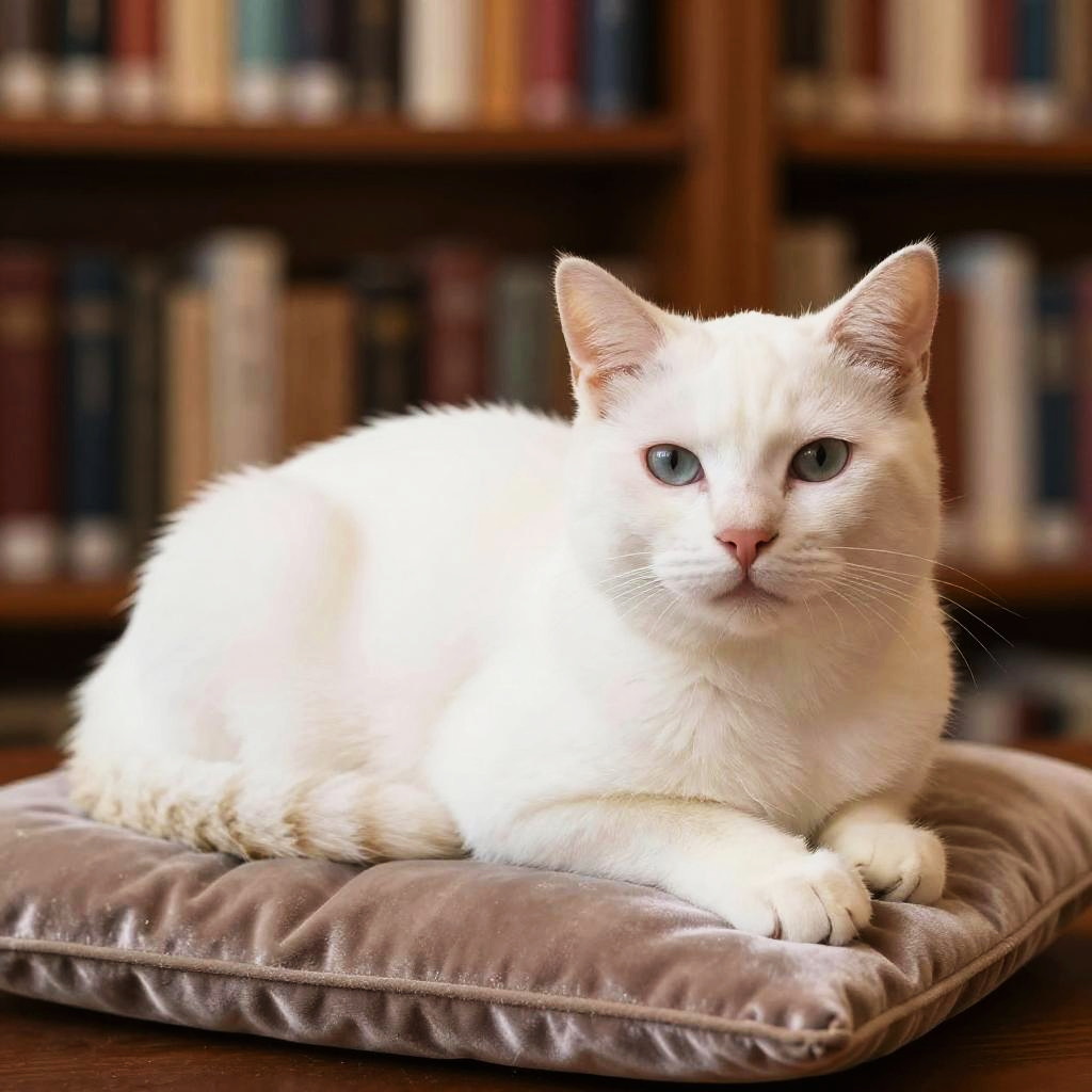 White cat smile, serene and peaceful, curled up on a plush velvet cushion in a cozy library, warm ambient lighting, highly detailed fur and whiskers, inviting and calm mood