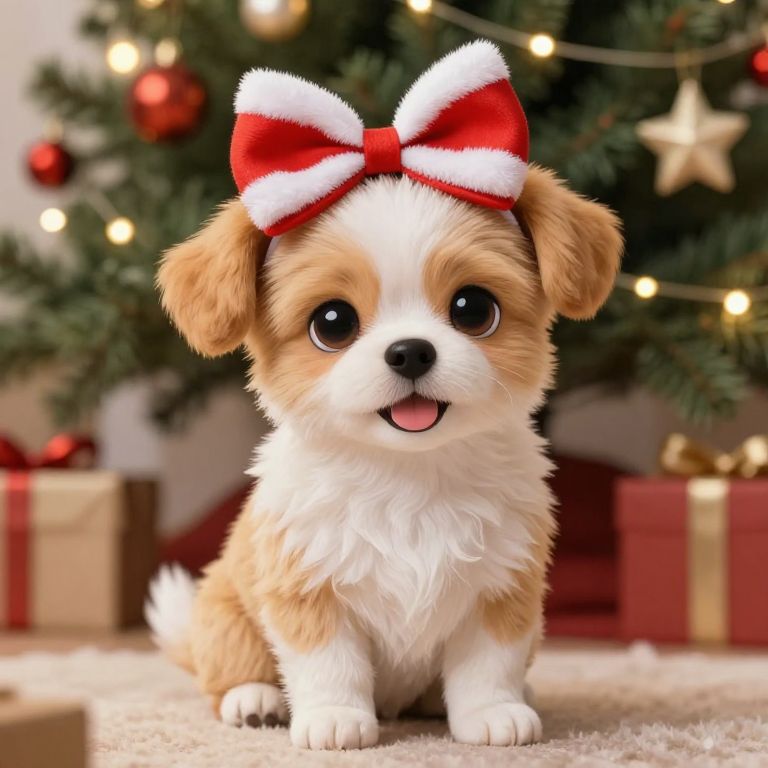 \"Create a high-quality, extremely detailed digital artwork in a high-resolution, anime-inspired style, Portrait of a miniature puppy with large expressive eyes, wearing an cute Christmas bow on its head, Sitting happily under the Christmas tree, Twinkling Christmas lights