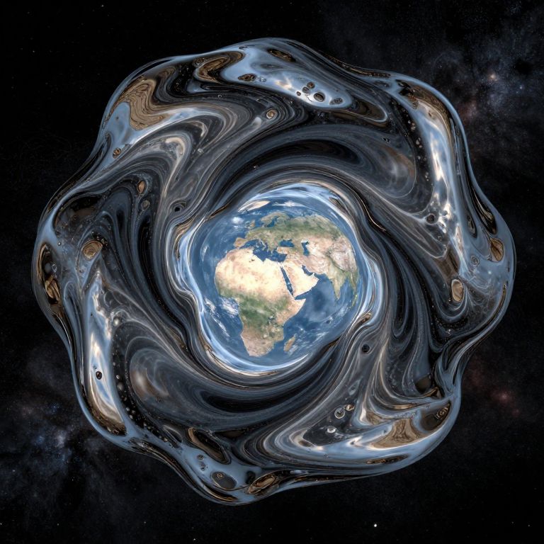 A digital CGI artwork depicts Earth at the center, surrounded by a swirling, abstract, metallic-like vortex. The vortex features fluid, wavy patterns with iridescent blue, silver, and black hues, resembling liquid metal. Earth's bright blue and green continents are surrounded by a glowing white light, contrasting with the dark, star-speckled outer space background. The swirling vortex creates a sense of motion and depth, emphasizing the planet's central position. The overall style blends realistic planetary depiction with abstract, futuristic elements, creating a visually striking and dynamic composition.