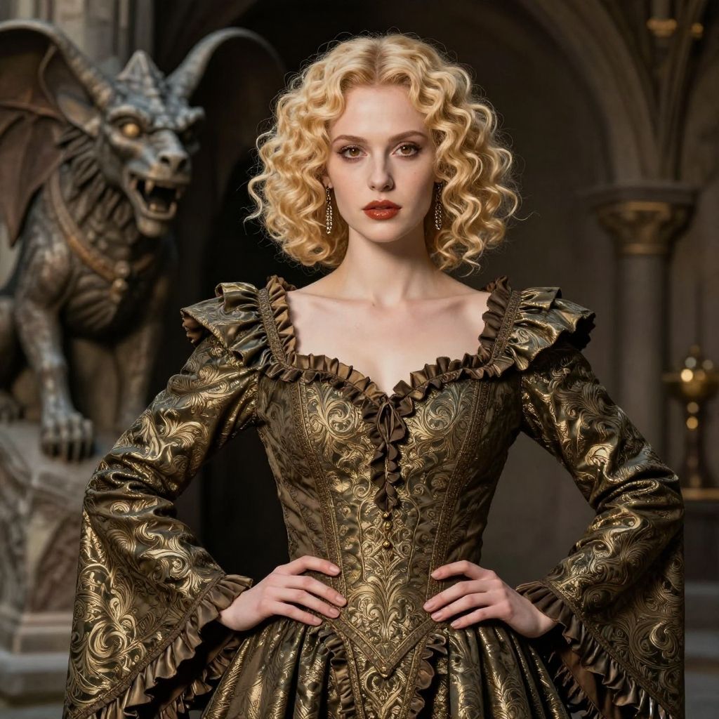 Photorealistic digital art of a blonde woman with curly hair in an ornate, medieval-style, dark gold dress with frilled sleeves, standing confidently
