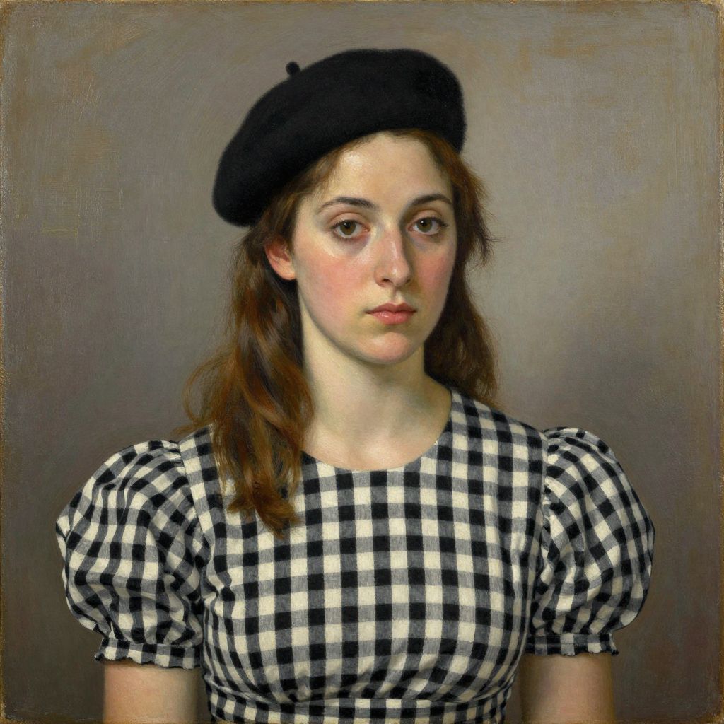 Photorealistic painting of a young woman with fair skin, brown eyes, and brown hair, wearing a black beret and black-and-white checkered