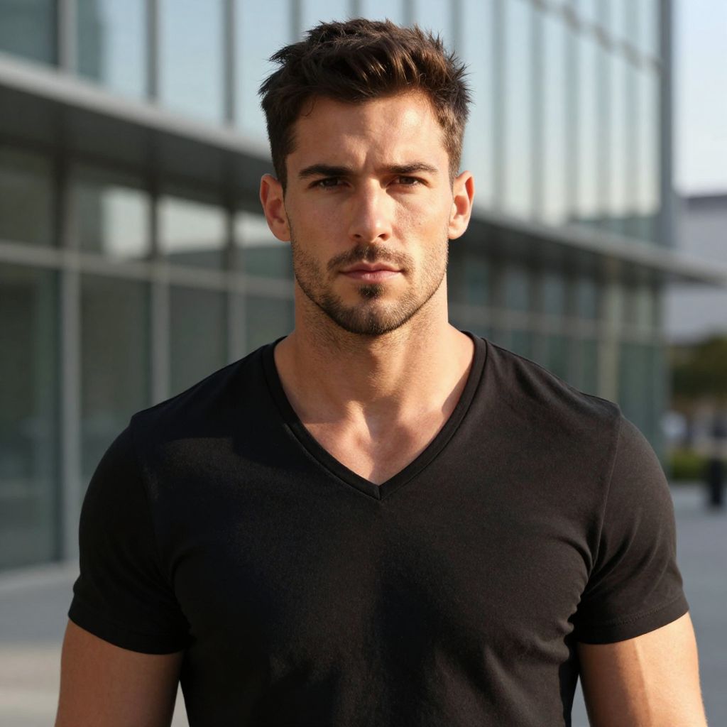 A confident man poses casually with his arms crossed, showcasing a muscular build. He wears a stylish denim shirt, adding to the modern and relaxed vibe of the urban setting behind him.