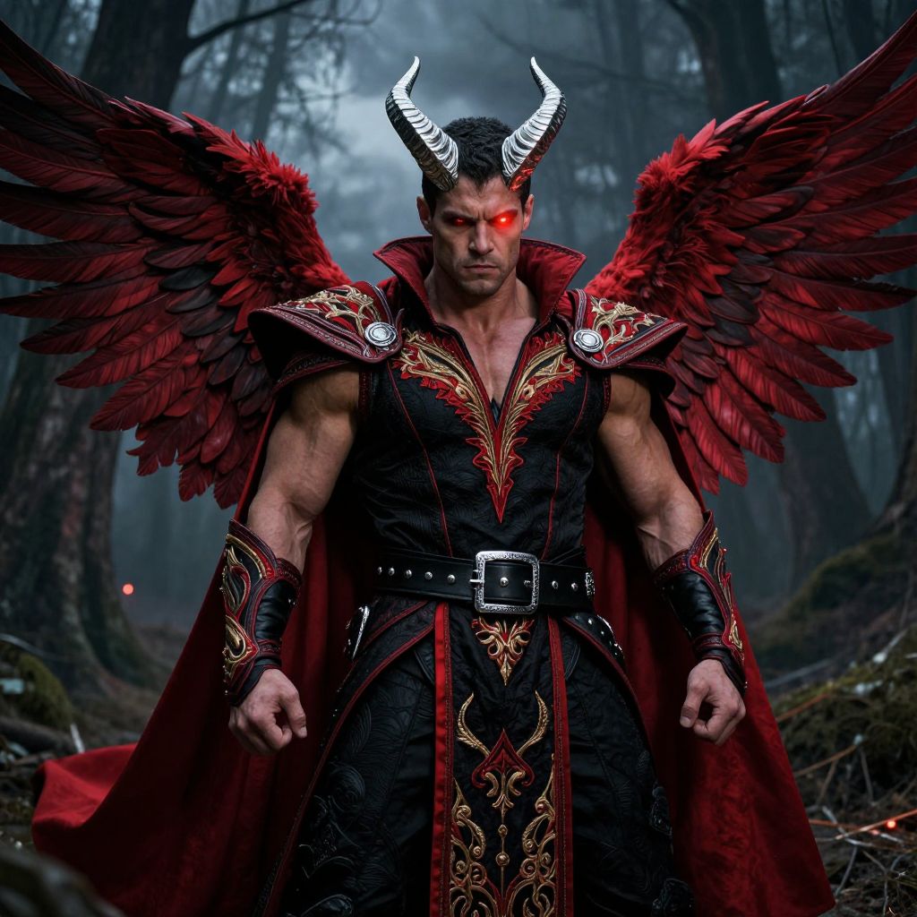 A muscular man with prominent silver horns growing from his head, wearing a detailed black and red costumed suit adorned with intricate golden embroidery, flowing red cape, and large feathered wings that extend dramatically from his back. He wears a black leather belt with silver buckles, and his expression is fierce and confident, standing in a dark, stormy forest at twilight with glowing red eyes. The atmosphere is mysterious and powerful, blending fantasy and realism.