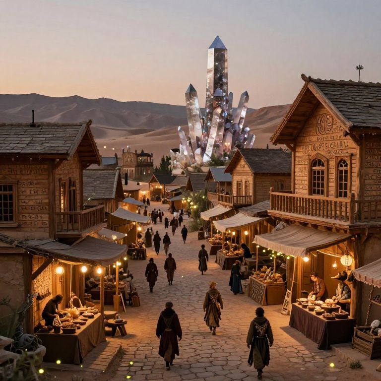A fantasy western town nestled in a desert valley, with towering crystal spires, wooden façades covered in ancient runes, a lively marketplace filled with both humans and mythical beings, cobblestone streets illuminated by magical fireflies, warm and mysterious ambiance.