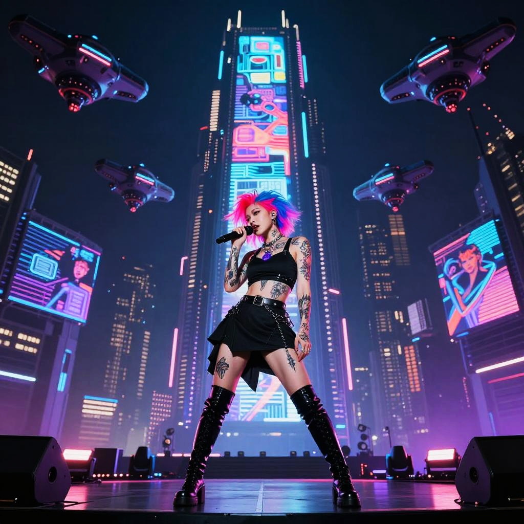 Cyberpunk Neon Singer on High-Tech Stage