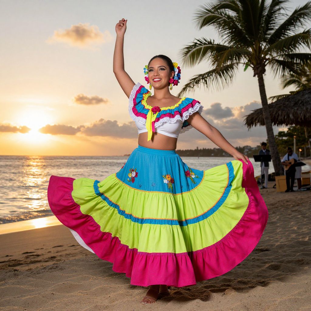 High-quality realistic image of a confident and graceful Colombian woman in a traditional cumbia costume with a flowing skirt in tropical colors — bright magenta, lime green, and sky blue — dancing on a tropical beach at dusk, golden sunlight reflecting off the water, her face lit by the setting sun, with palm trees swaying in the breeze, local music playing softly in the background. The woman has big tits and cute face