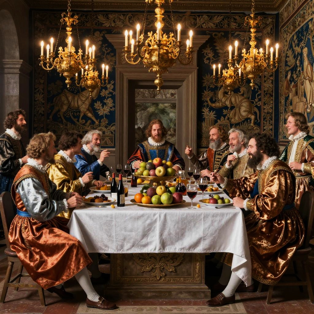 Dinastia opulent banquet scene in Renaissance style, nobles dressed in elaborate silk costumes, golden chandeliers casting warm glow, lavish feast with fruits and wine, intricate tapestries, lively expressions, dramatic shadows and highlights.