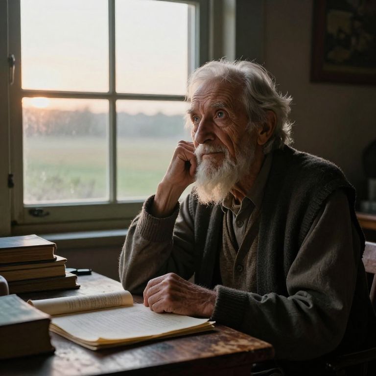 A photograph of an elderly white man with a white beard and glasses, wearing a dark, textured, button-up shirt, sitting at a wooden workbench. He is focused on assembling a small, intricate clock mechanism, using tweezers. The workbench is cluttered with various clock parts, tools, and a vintage clock with a white face and black numerals in the foreground. The background is a softly lit, rustic workshop with shelves and framed pictures. The image has a shallow depth of field, emphasizing the man and his work while blurring the background. The overall color palette is warm and earthy.