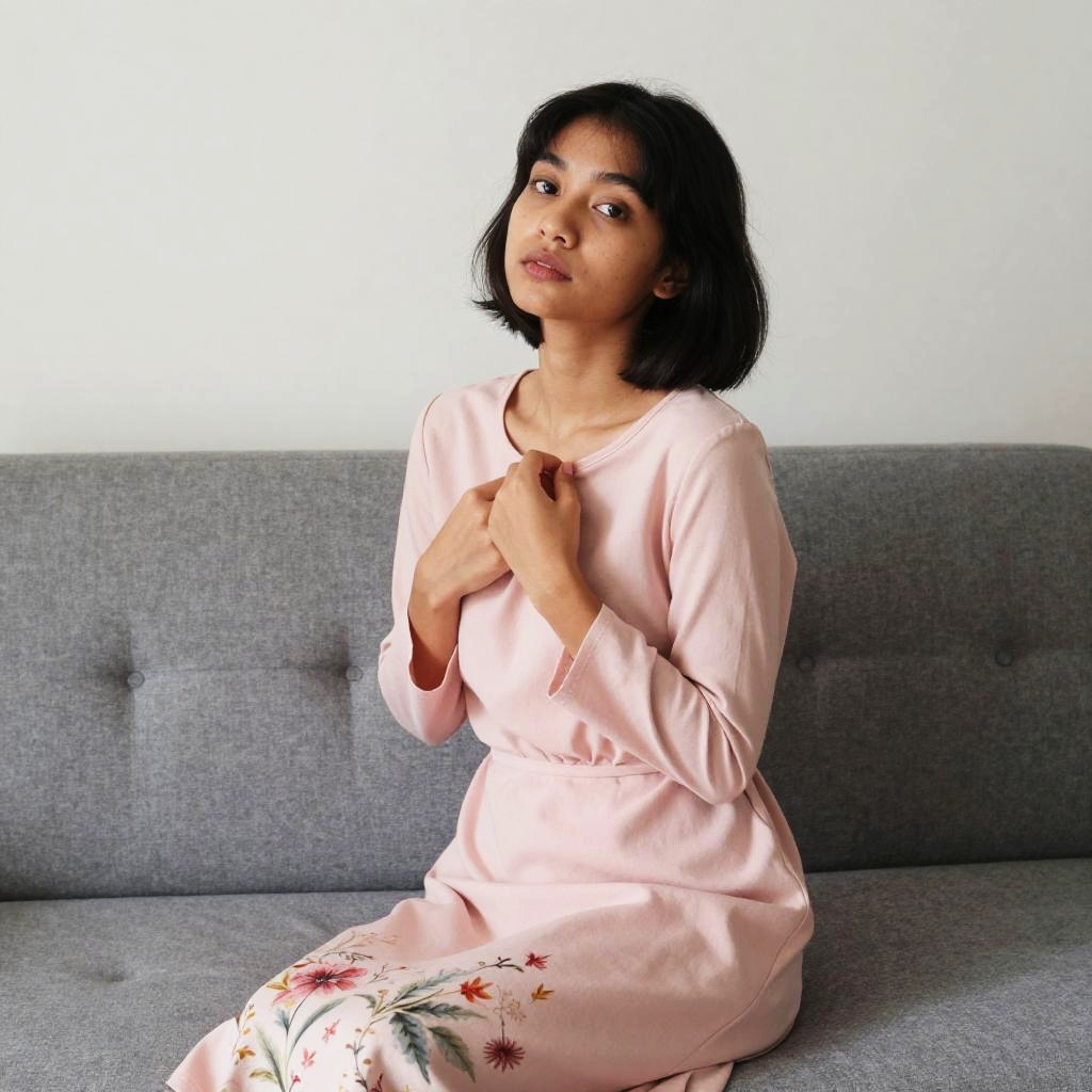 Photograph of a young woman with short black hair and light brown skin, sitting on a gray, tufted sofa. She's wearing a long, pale pink dress with long sleeves, holding the fabric near her chest. The dress has a floral pattern on the skirt. She looks up with a calm expression. The background is a plain, light-colored wall. The lighting is soft and natural.