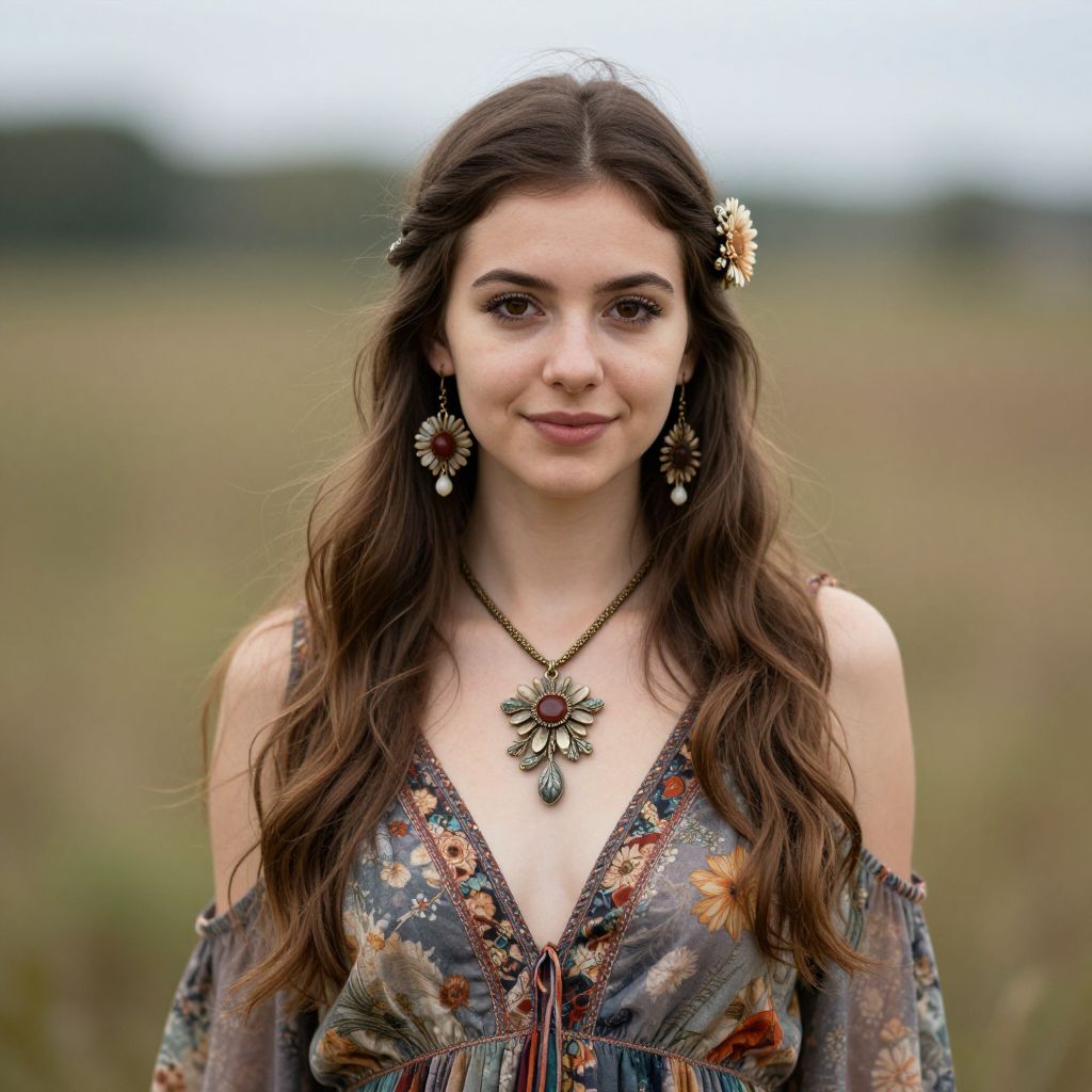 Photograph of a young woman with fair skin and long, wavy brown hair adorned with a small daisy. She has dark, arched eyebrows and wears a floral, off-the-shoulder dress with a deep V-neck, revealing a hint of cleavage. Her large, decorative earrings match her necklace, which features a sunburst design with a central flower. She smiles softly, standing in a blurred, grassy field under an overcast sky. The background is out of focus, emphasizing her as the central subject. The overall style is bohemian, with natural, earthy colors and textures.