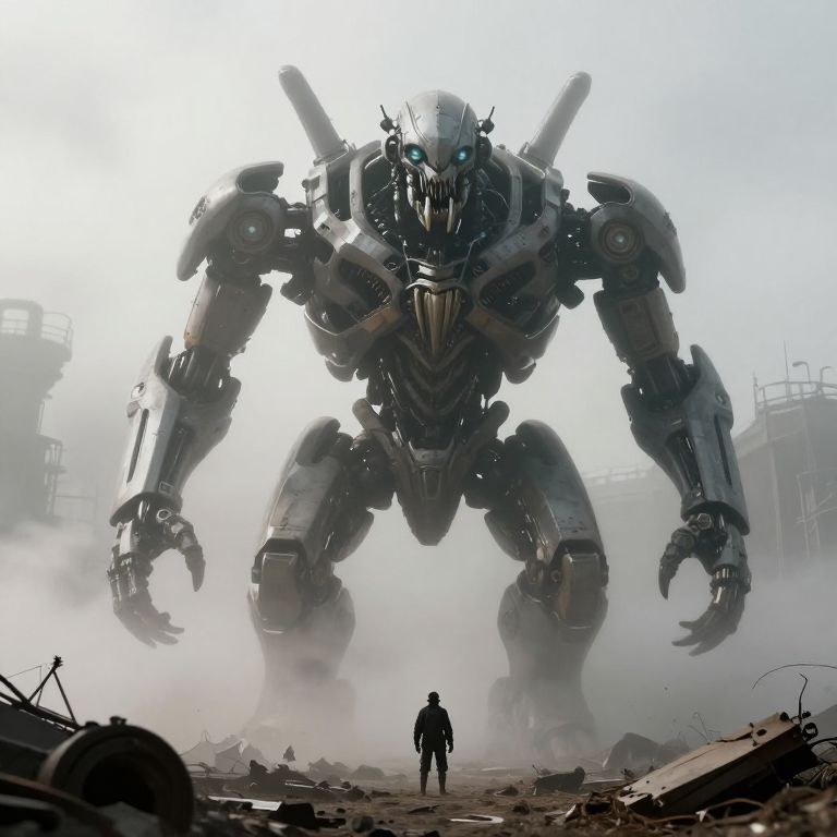 Photograph-like CGI image depicting a massive, menacing robot towering over a misty, industrial ruin. The robot has a bulky, armored body with intricate mechanical details, glowing blue eyes, and sharp, metallic teeth. Its large, clawed hands are outstretched, casting shadows. In the foreground, a small, silhouetted human figure stands facing the robot, emphasizing its immense size. The background shows rusted metal structures and debris, with a hazy, white mist adding an eerie atmosphere. The overall color palette includes dark grays and blacks, with subtle blue highlights on the robot. The scene evokes a sense of impending confrontation and futuristic dystopia.