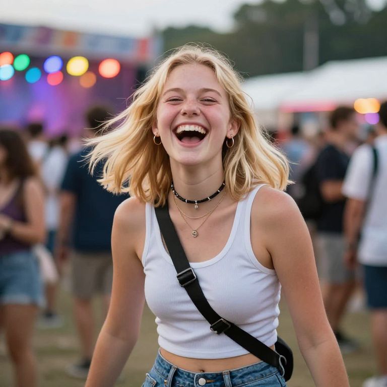 Blurred, dynamic image of a young woman dancing joyfully outdoors in bright sunlight. She wears a white tank top and ripped denim shorts, surrounded by a crowd of casually dressed people. The sunlight highlights her flowing hair, capturing a lively, energetic atmosphere.