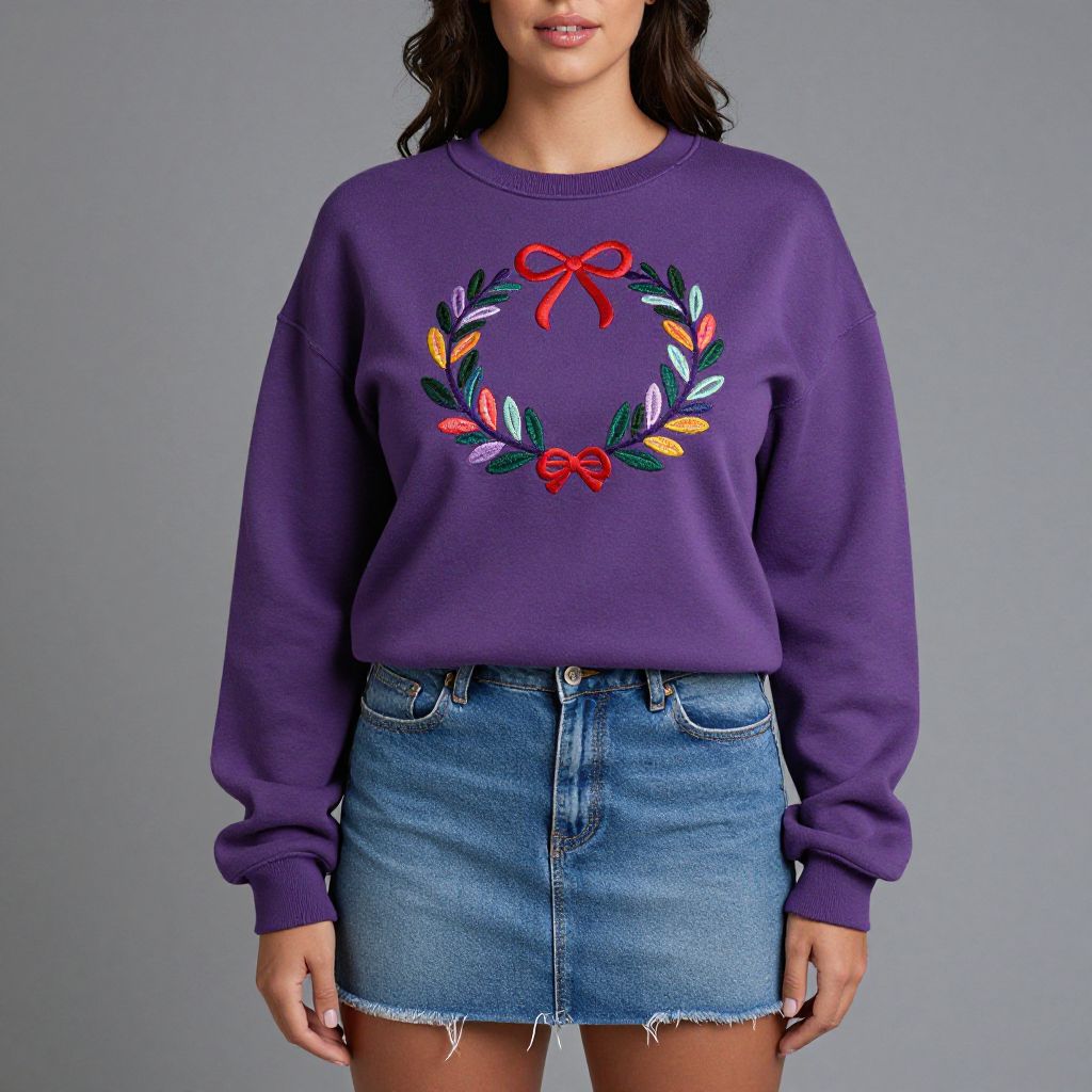 "Woman, casual, oversized purple crewneck sweatshirt with a vibrant embroidered holiday wreath motif featuring red bow detail, relaxed fit, ribbed cuffs and hem, paired with a blue denim mini skirt, plain design with a frayed hem, grey background in a photo studio setting.. Sexy. Pretty face and beаutiful eyes. Big breasts."