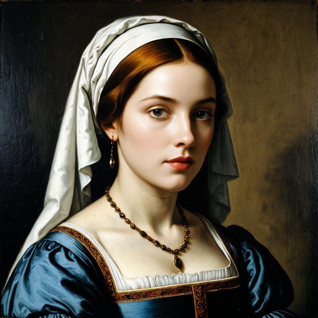 A detailed portrait painting of a young woman with long wavy brown hair and fair skin, dressed in a Renaissance-style garment with delicate lace and embroidery. The warm, muted background emphasizes the classical and timeless aesthetic typical of Renaissance art.