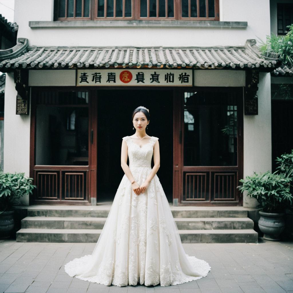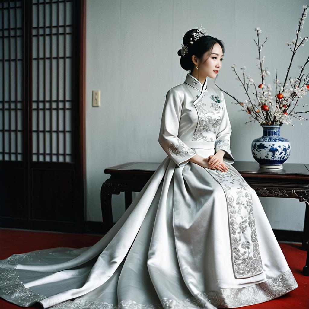 White Traditional Chinese Wedding Dress, woman in a silver dress with a tiable and a white dress