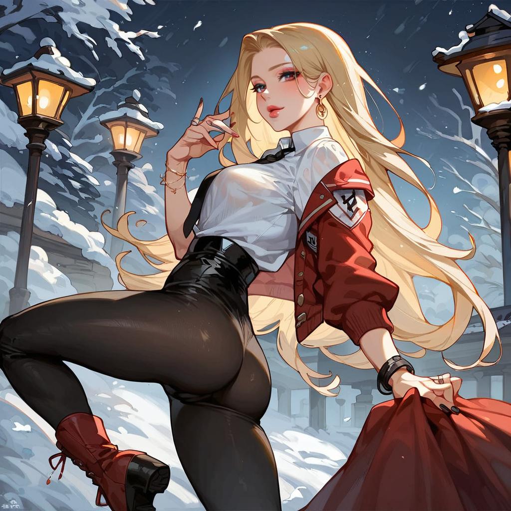 Score_9, score_8_up, score_7_up, beautiful aesthetic, 1 girl, fullheight, slim waist, slim, petite, slender, showing ass, sexy face expression, (dynamic_pose:1.3), close up on beautiful freckled face, black yoga pants, slightly visible cameltoe, see-through white top, beautiful legs and thighs, blond long hair, white socks, Suede boots, short university varsity jacket, rings, earrings, chocker, black nail, young, smallchest, small hips, smallass, (tits bursting out of her top), bloom, (park square), nighttime, full moon, winter, snowing, looking_longingly