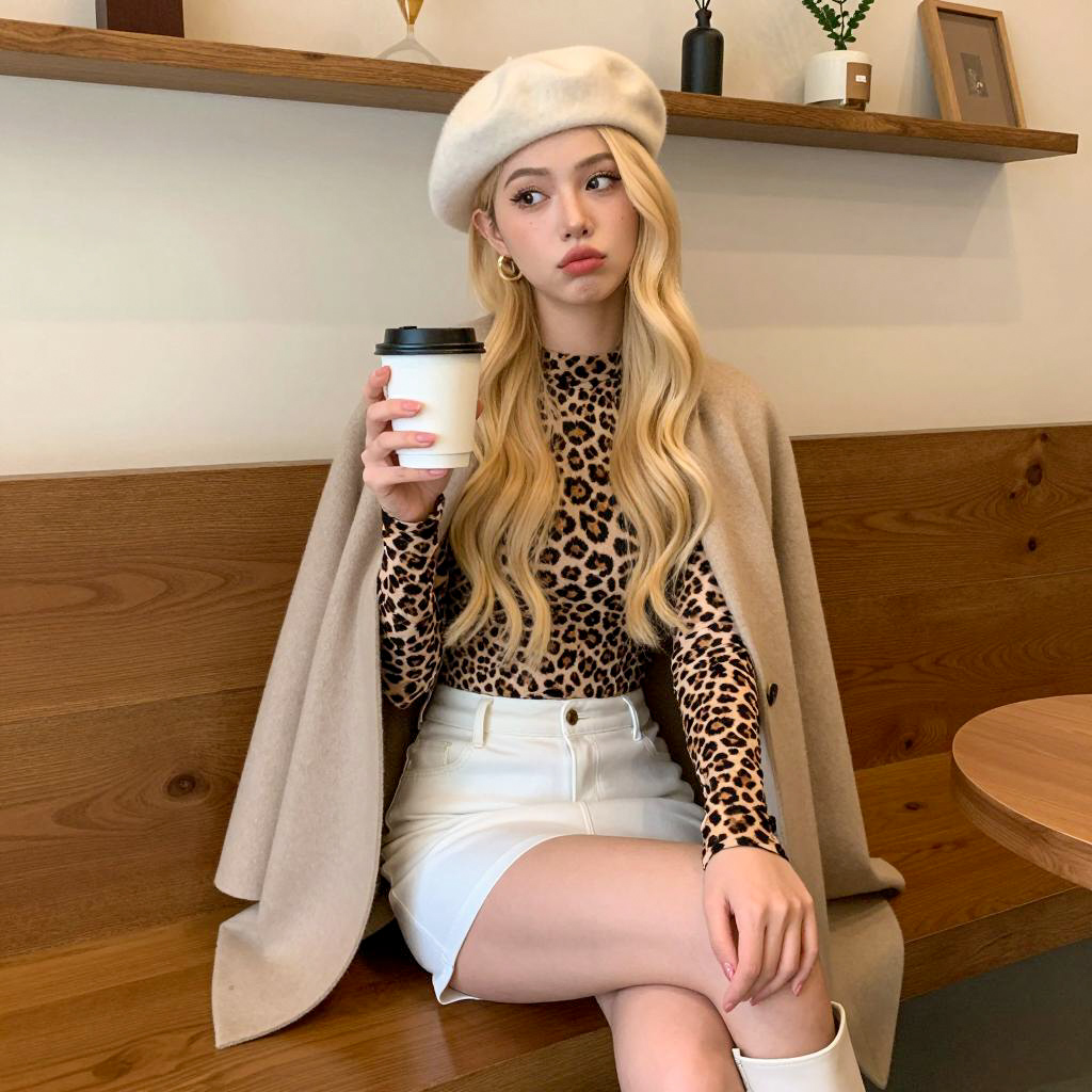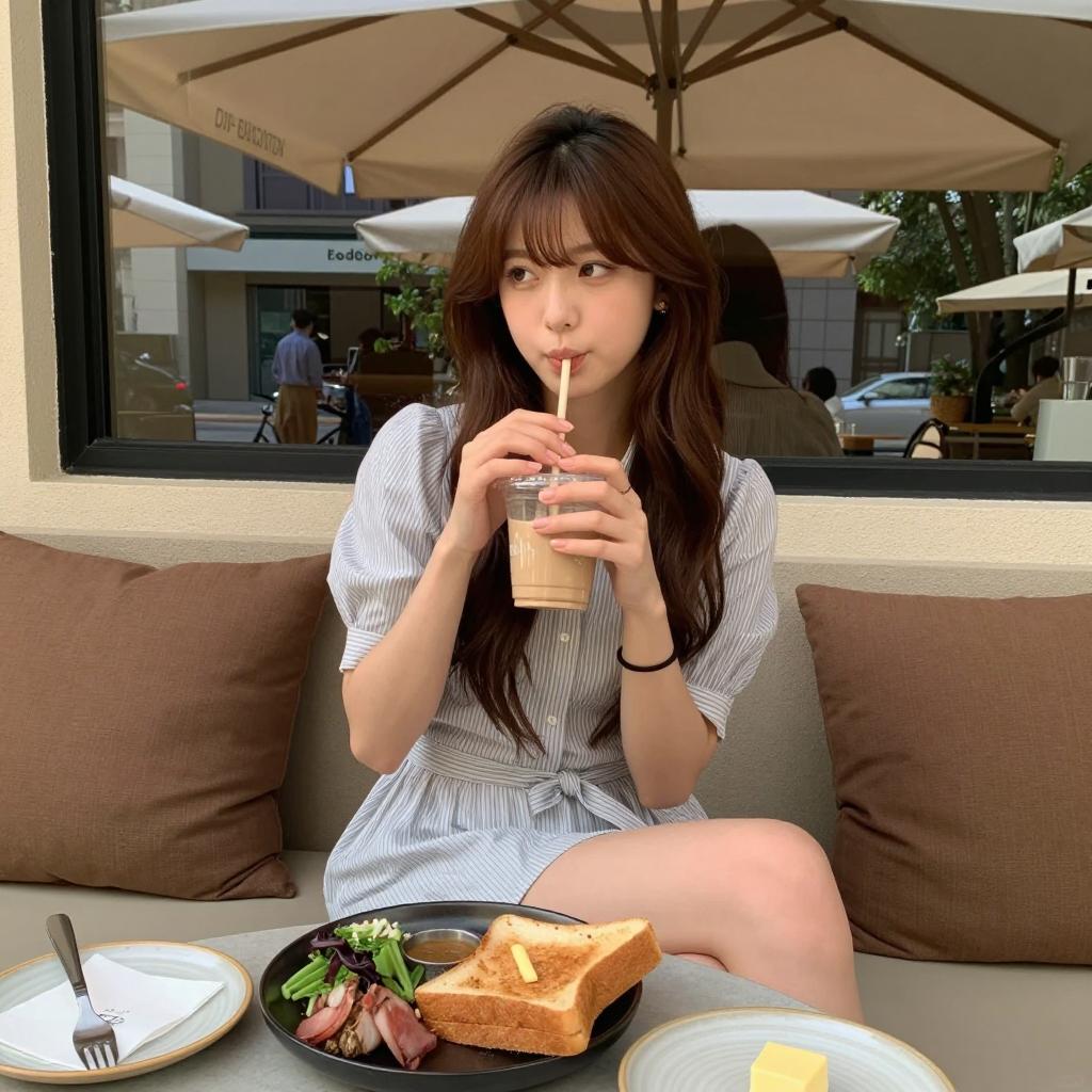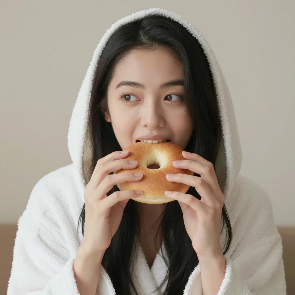 Photograph of a woman with long brown hair, wearing a light blue off-shoulder top, holding a coffee mug in her right hand and a pretzel in her left. She has a cross necklace and large flower earrings. Her nails are red. In the foreground, a gray and white handbag is on a white surface. She looks to the right with a neutral expression.