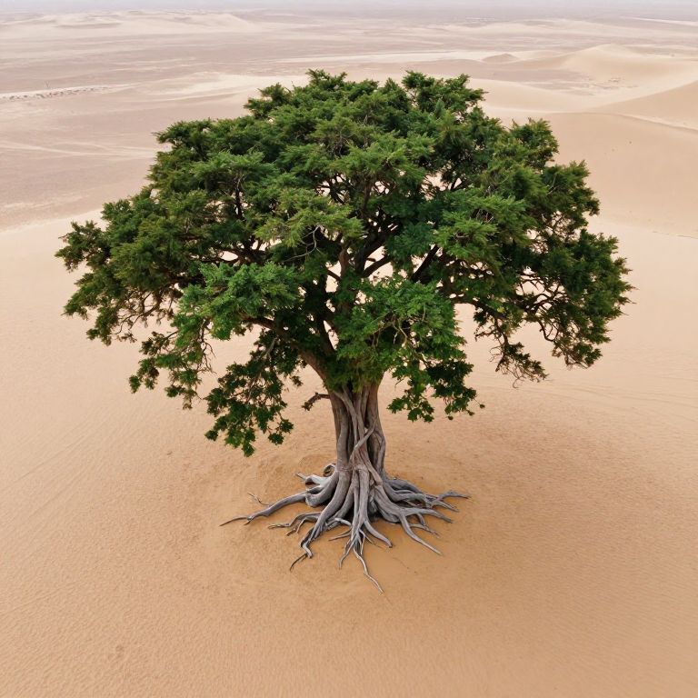 An aerial view uncovers a fantastical landscape where an immense tree stands tall amidst a vast desert. This mythical tree's twisted branches reach towards the heavens, as if shaped by countless years. From this high vantage point, there's a stark contrast between the lush life of the colossal tree and the barren sands that encircle it, instilling both reverence and solitude. The scene invites contemplation on nature's enduring strength amidst harsh surroundings, embodied in this solitary guardian within an expansive sea of tranquility.