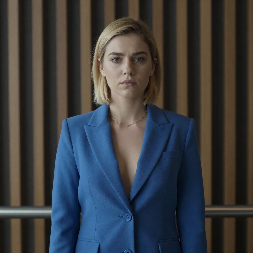 Photograph of a young woman with short blonde hair, wearing a blue ured blazer, and a gold necklace. She has a serious expression, looking slightly to the right. She stands against a dark background with vertical wooden slats and a metal railing in the foreground.