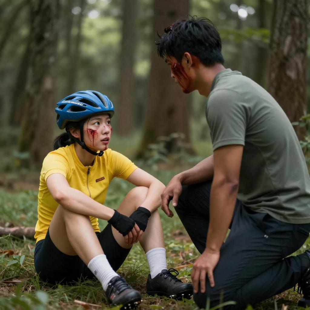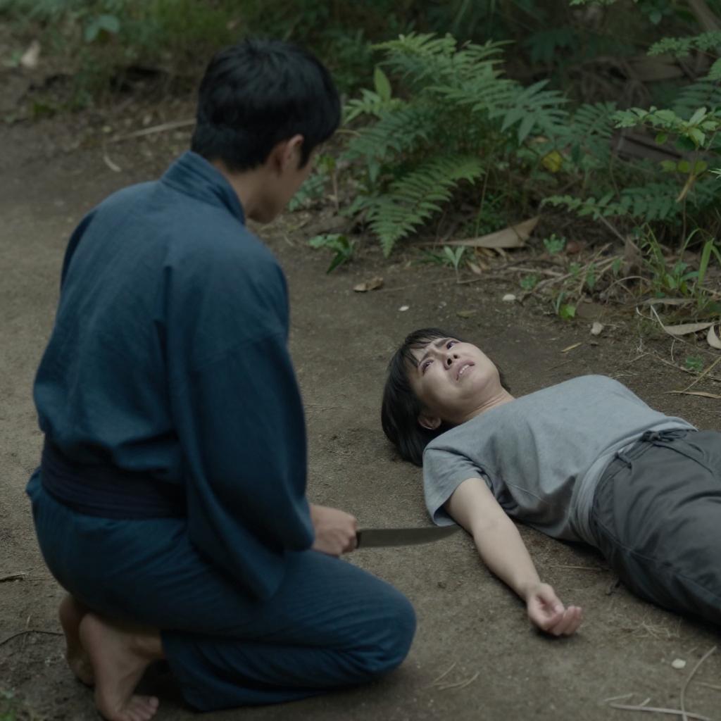 Man with short black hair in blue kimono, holding knife, kneeling on dirt path, looking at injured woman with short black hair in grey shirt, lying on ground, surrounded by green foliage. Man's back to camera, woman's face shows pain.