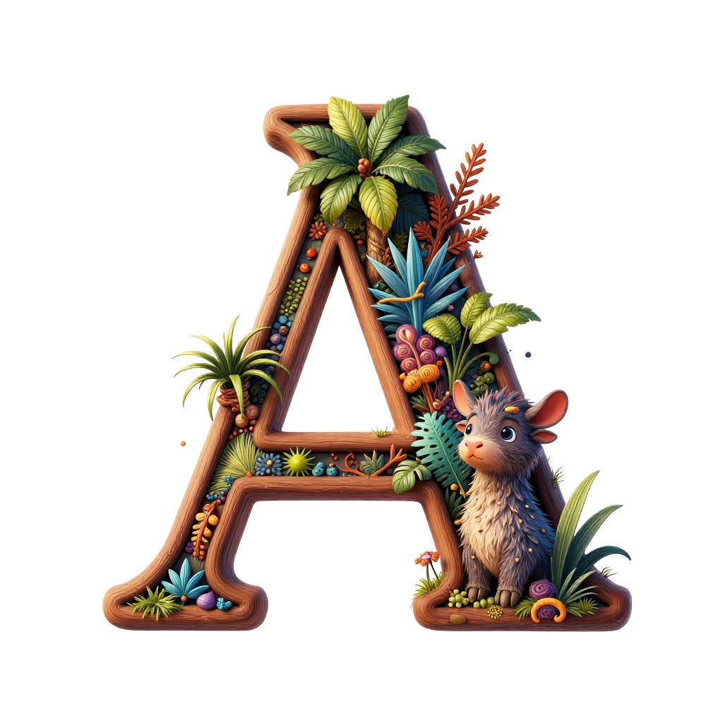 Highly detailed and vividly colored 3D cartoon-style letter A decorated with intricate foliage, plants, and a realistic mouse figure. The composition combines wood textures and natural elements in a photorealistic style, rendered with soft volumetric lighting to create an ultra HD artistic effect.