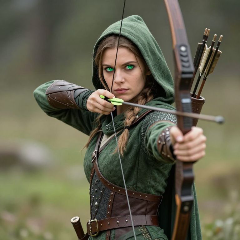 Elf archer Jera-Y stands poised with a drawn bow, her vibrant green eyes fixed forward, wearing a hooded cloak and quiver filled with arrows slung over her shoulder, embodying readiness and determination.