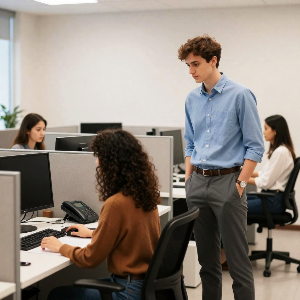 Blonde man in gray suit, seated at cluttered desk, signing document. Desk has papers, files, computer, and snacks. Standing woman in beige shirt and black skirt partially visible on left. Office setting with stacked papers and blinds in background. Man has focused expression.