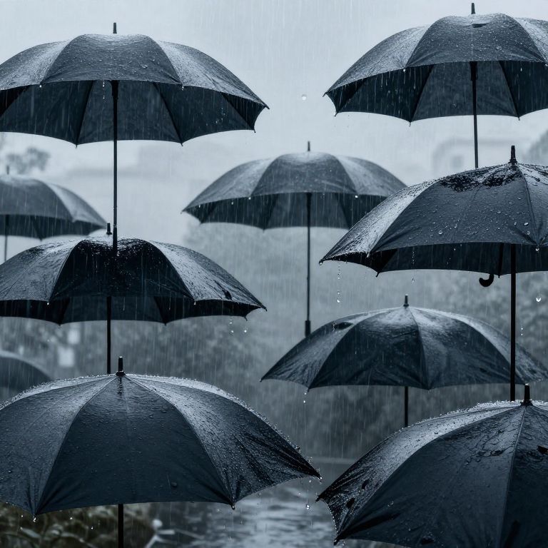 Photograph of multiple black umbrellas with raindrops, arranged in a grid pattern against a misty, rainy background, creating a moody, atmospheric