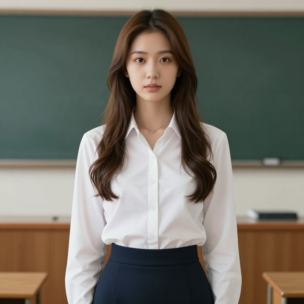 Photograph of an Asian woman standing in a classroom. She has long, wavy dark brown hair and wears a white button-up shirt with a black high-waisted skirt. Her expression is neutral, and she gazes directly at the camera. The background features a dark green chalkboard and wooden desks. The lighting is bright and even, highlighting her clear skin and sharp features. She wears a delicate silver necklace. The image has a realistic, professional quality, focusing on her formal attire and poised demeanor.