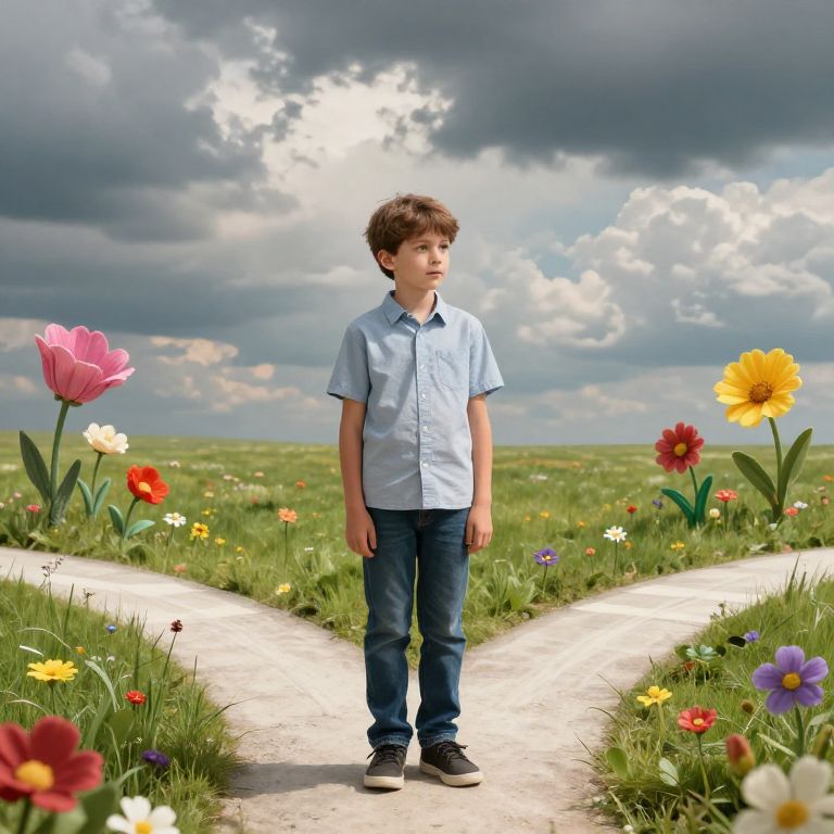 Photograph of a young boy with short, dark brown hair standing in front of a blurred, stone church. He wears a light blue hoodie and holds a large, blue egg with yellow polka dots. The egg is oversized, almost as big as his torso. The background features a symmetrical garden path lined with blooming tulips in yellow, red, and white. The church has arched windows and a beige stone facade. The boy's expression is neutral, and he stands with a slight tilt to his head, looking off to the side. The image has a slightly surreal, hyper-realistic style.