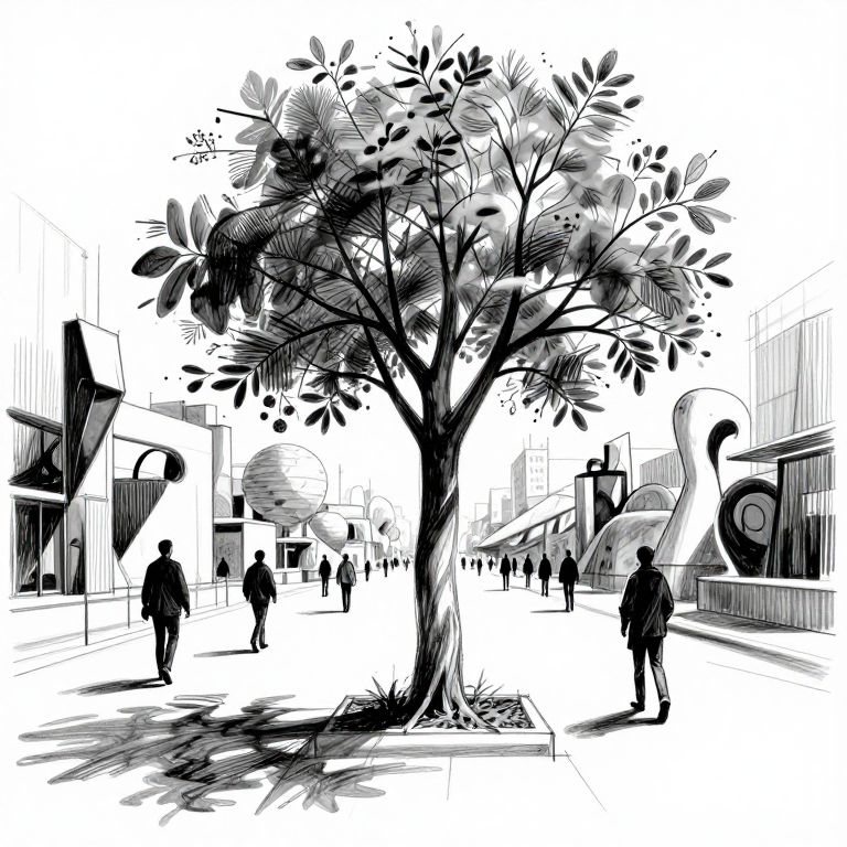 The image is a hand-drawn, black and white sketch of an urban space, featuring a large, abstract tree with intricate branches and leaves. The tree stands prominently in the foreground, casting long shadows on the ground. Surrounding the tree are several people, walking or standing, dressed in dark clothing that contrasts with the lighter background. The background is filled with various sculptures and architectural elements, including large, geometric shapes and organic forms, creating a sense of depth and complexity. The overall composition is balanced, with the tree serving as a central focal point, drawing the viewer's eye through the scene. The interplay of shapes, textures, and shadows adds a dynamic quality to the image, capturing the essence of a bustling city environment.