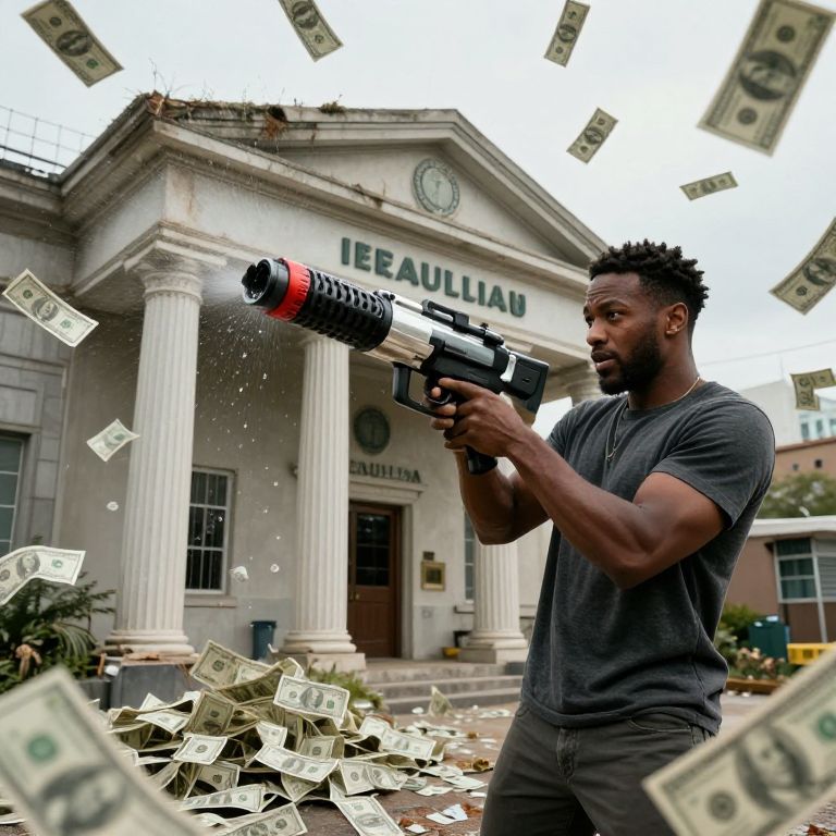 Transformation jay powell using a us dollar bill bazooka to flood a decrepit modern bank with dollar bills. dollar bills fall from the sky and overwhelm the bank,