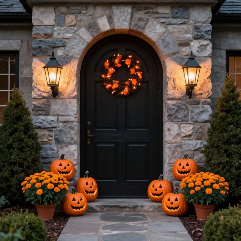 Gothic-inspired Halloween decorations adorn a stone archway entrance, featuring a dark wooden door framed by two glowing wall sconces, a wreath of orange lights above, and six carved pumpkins with jack-o'-lantern faces flanked by vibrant potted marigolds, all set against a backdrop of neatly trimmed shrubs and a pathway lined with stepping stones.